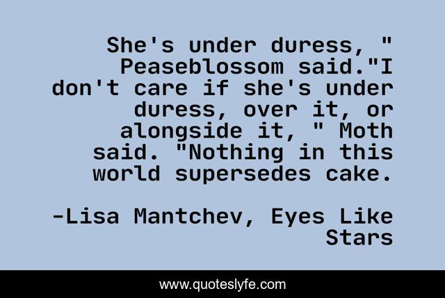 This page presents the quote "She's under duress, " Peaseblossom said."I don't care if she's under duress, over it, or alongside it, " Moth said. "Nothing in this world supersedes cake.". Author of this quote is Lisa Mantchev, Eyes Like Stars. .