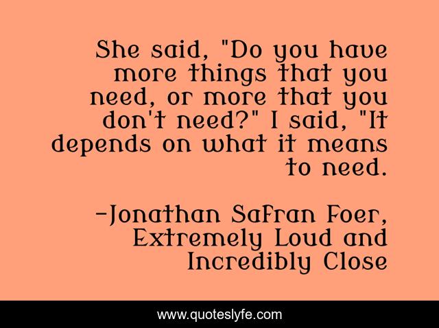 This page presents the quote "She said, "Do you have more things that you need, or more that you don't need?" I said, "It depends on what it means to need.". Author of this quote is Jonathan Safran Foer, Extremely Loud and Incredibly Close. .