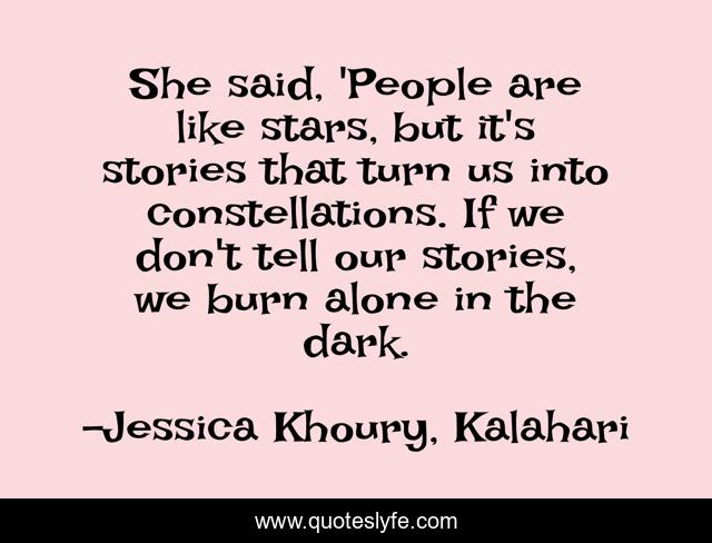 This page presents the quote "She said, 'People are like stars, but it's stories that turn us into constellations. If we don't tell our stories, we burn alone in the dark.". Author of this quote is Jessica Khoury, Kalahari. .