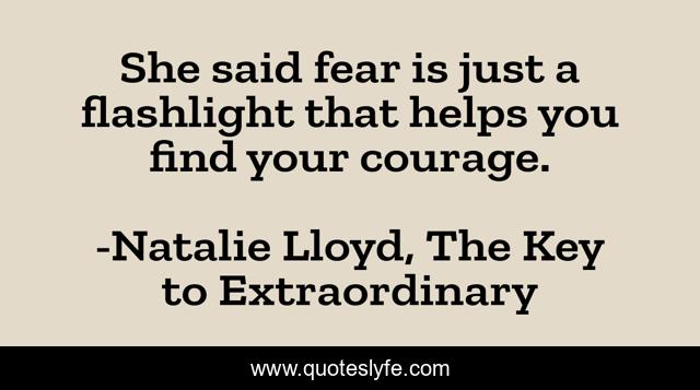 This page presents the quote "She said fear is just a flashlight that helps you find your courage.". Author of this quote is Natalie Lloyd, The Key to Extraordinary. This quote is about fear, courage,.