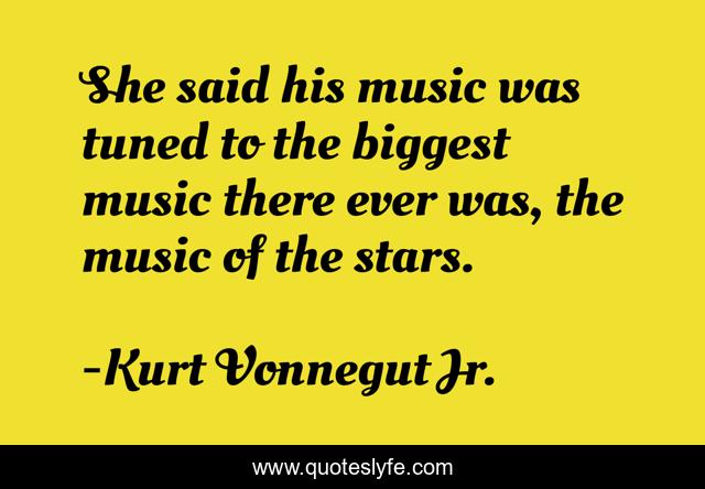 This page presents the quote "She said his music was tuned to the biggest music there ever was, the music of the stars.". Author of this quote is Kurt Vonnegut Jr.. This quote is about life, beautiful-writing, music, stars,.