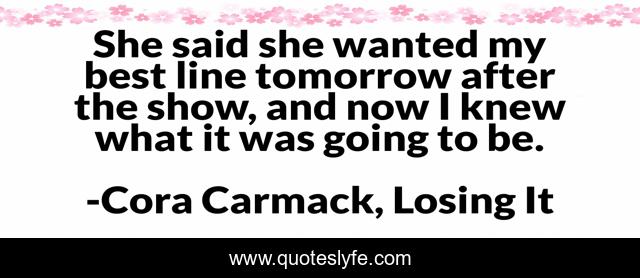 This page presents the quote "She said she wanted my best line tomorrow after the show, and now I knew what it was going to be.". Author of this quote is Cora Carmack, Losing It. This quote is about love, garrick, marriage, losing-it, bliss, line, affection,.