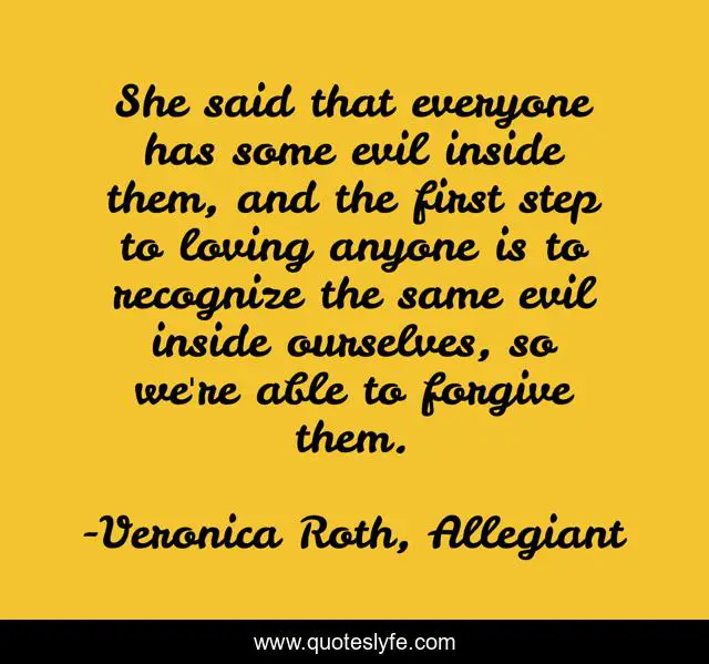 This page presents the quote "She said that everyone has some evil inside them, and the first step to loving anyone is to recognize the same evil inside ourselves, so we're able to forgive them.". Author of this quote is Veronica Roth, Allegiant. .