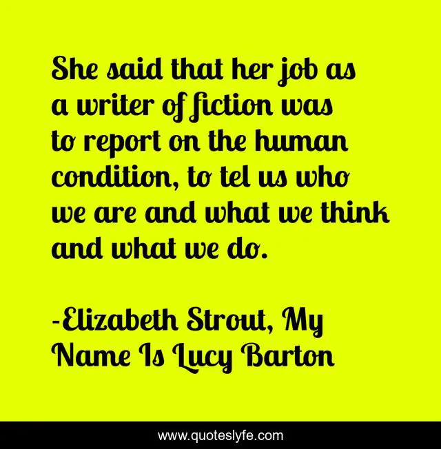 This page presents the quote "She said that her job as a writer of fiction was to report on the human condition, to tel us who we are and what we think and what we do.". Author of this quote is Elizabeth Strout, My Name Is Lucy Barton. This quote is about humanity, writing,.