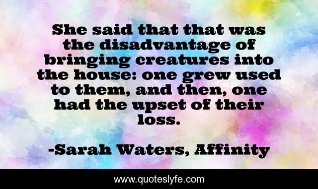 This page presents the quote "She said that that was the disadvantage of bringing creatures into the house: one grew used to them, and then, one had the upset of their loss.". Author of this quote is Sarah Waters, Affinity. This quote is about loss, life, creatures, upset, disadvantage,.