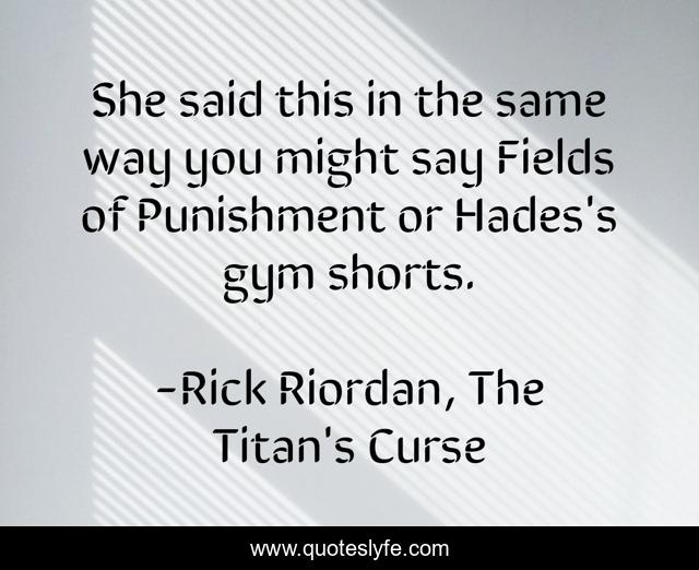 This page presents the quote "She said this in the same way you might say Fields of Punishment or Hades's gym shorts.". Author of this quote is Rick Riordan, The Titan's Curse. This quote is about funny, comedy, humor,.