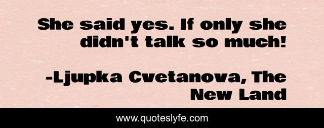 This page presents the quote "She said yes. If only she didn't talk so much!". Author of this quote is Ljupka Cvetanova, The New Land. This quote is about funny, aphorism, humor, humorous, quote, irony, accept, talk, woman,.