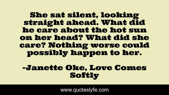 This page presents the quote "She sat silent, looking straight ahead. What did he care about the hot sun on her head? What did she care? Nothing worse could possibly happen to her.". Author of this quote is Janette Oke, Love Comes Softly. This quote is about christian, women-inspirational,.