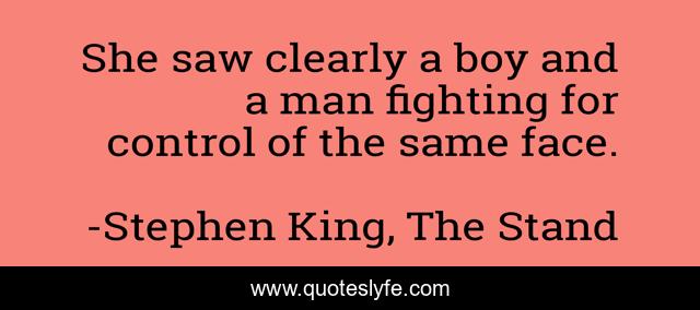 This page presents the quote "She saw clearly a boy and a man fighting for control of the same face.". Author of this quote is Stephen King, The Stand. This quote is about comingofage, growing-up, teenager,.