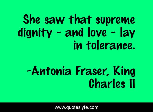 This page presents the quote "She saw that supreme dignity - and love - lay in tolerance.". Author of this quote is Antonia Fraser, King Charles II. This quote is about dignity, tolerance, affection, love,.