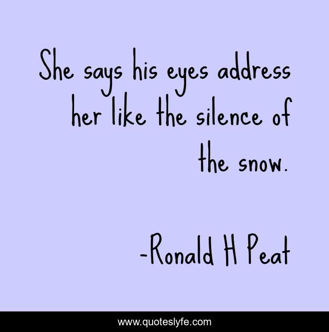 This page presents the quote "She says his eyes address her like the silence of the snow.". Author of this quote is Ronald H Peat. This quote is about eyes, snow, silence,.