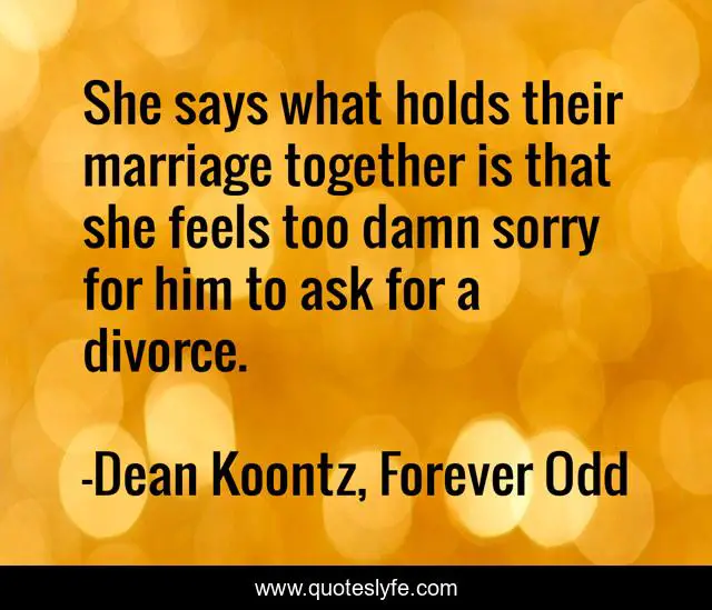 This page presents the quote "She says what holds their marriage together is that she feels too damn sorry for him to ask for a divorce.". Author of this quote is Dean Koontz, Forever Odd. This quote is about pity, divorce, marriage, feel-sorry,.