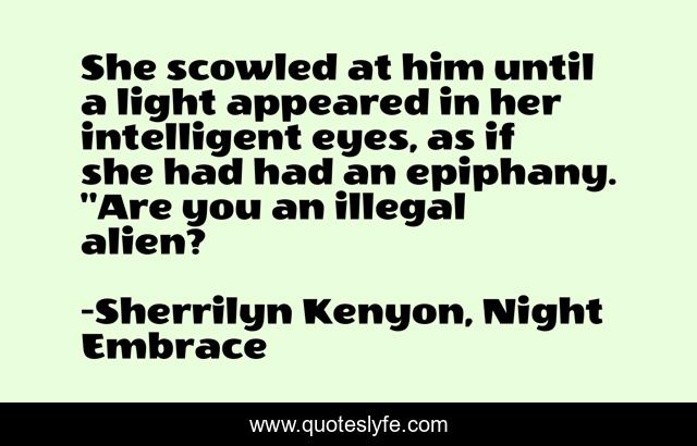 This page presents the quote "She scowled at him until a light appeared in her intelligent eyes, as if she had had an epiphany. "Are you an illegal alien?". Author of this quote is Sherrilyn Kenyon, Night Embrace. This quote is about crazy, illegal, sunshine, alien, talon, epiphany,.