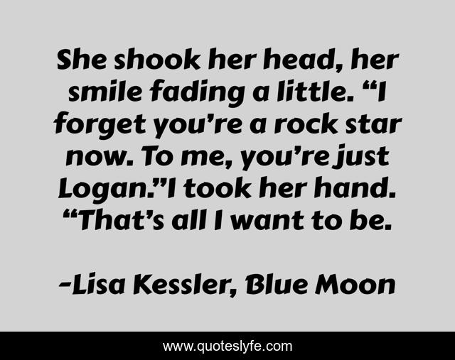 This page presents the quote "She shook her head, her smile fading a little. “I forget you’re a rock star now. To me, you’re just Logan.”I took her hand. “That’s all I want to be.". Author of this quote is Lisa Kessler, Blue Moon. This quote is about moon-series, paranormal-romance,.