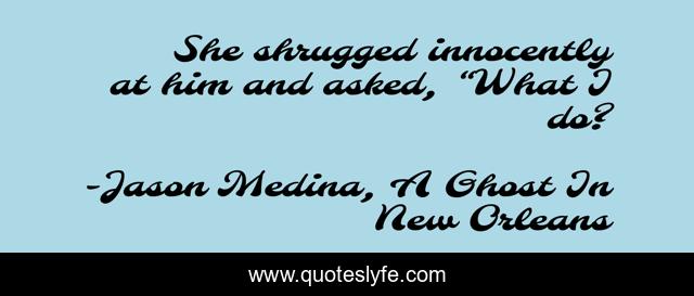 This page presents the quote "She shrugged innocently at him and asked, “What I do?". Author of this quote is Jason Medina, A Ghost In New Orleans. This quote is about shrug, shrugged, tribal-publications-inc, a-ghost-in-new-orleans, rini, innocence, tribal-publications, jason-medina,.