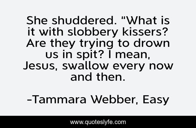 This page presents the quote "She shuddered. “What is it with slobbery kissers? Are they trying to drown us in spit? I mean, Jesus, swallow every now and then.". Author of this quote is Tammara Webber, Easy. This quote is about funny-but-true, gross, kissing, laugh-out-loud,.