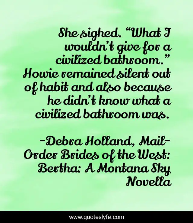 This page presents the quote "She sighed. “What I wouldn’t give for a civilized bathroom.” Howie remained silent out of habit and also because he didn’t know what a civilized bathroom was.". Author of this quote is Debra Holland, Mail-Order Brides of the West: Bertha: A Montana Sky Novella. This quote is about mail-order-bride, clean-romance, western-romance, historical-romance, sweet-romance,.