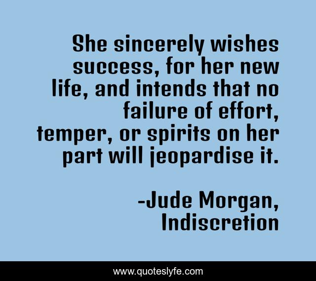 This page presents the quote "She sincerely wishes success, for her new life, and intends that no failure of effort, temper, or spirits on her part will jeopardise it.". Author of this quote is Jude Morgan, Indiscretion. This quote is about positive, confidence, motivational, optimistic,.