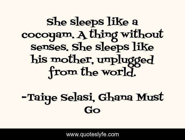 This page presents the quote "She sleeps like a cocoyam. A thing without senses. She sleeps like his mother, unplugged from the world.". Author of this quote is Taiye Selasi, Ghana Must Go. This quote is about thought, disconnection, sleep,.