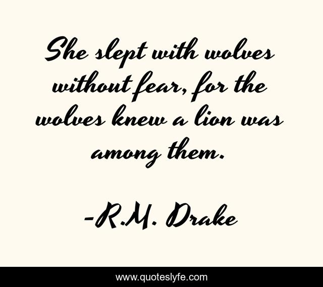 This page presents the quote "She slept with wolves without fear, for the wolves knew a lion was among them.". Author of this quote is R.M. Drake. This quote is about wolves, fear, lion,.