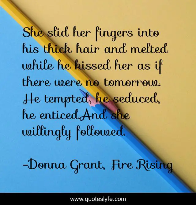 This page presents the quote "She slid her fingers into his thick hair and melted while he kissed her as if there were no tomorrow. He tempted, he seduced, he enticed.And she willingly followed.". Author of this quote is Donna Grant, Fire Rising. This quote is about romance, highlanders, paranormal, dragons,.