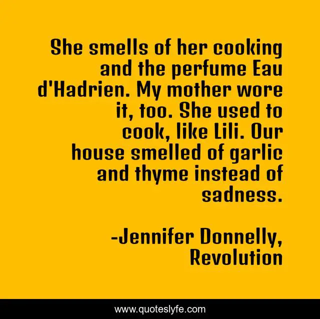 This page presents the quote "She smells of her cooking and the perfume Eau d'Hadrien. My mother wore it, too. She used to cook, like Lili. Our house smelled of garlic and thyme instead of sadness.". Author of this quote is Jennifer Donnelly, Revolution. This quote is about urban, sad, tragic, historical-fiction, young-adult-series,.