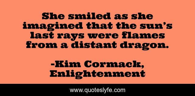 This page presents the quote "She smiled as she imagined that the sun’s last rays were flames from a distant dragon.". Author of this quote is Kim Cormack, Enlightenment. This quote is about afterlife, immortality, immortals,.