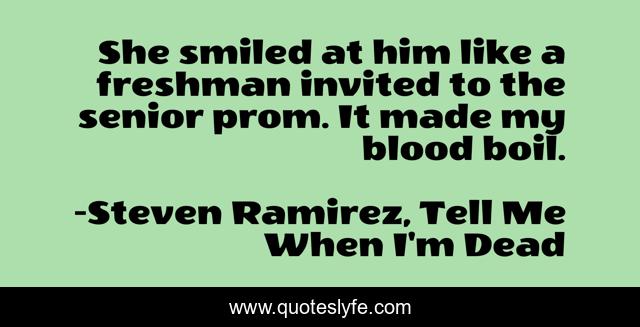 This page presents the quote "She smiled at him like a freshman invited to the senior prom. It made my blood boil.". Author of this quote is Steven Ramirez, Tell Me When I'm Dead. This quote is about drunk, novel, dead, zombie-thriller, soldiers, paranormal-thriller, horde, na, hordes,.