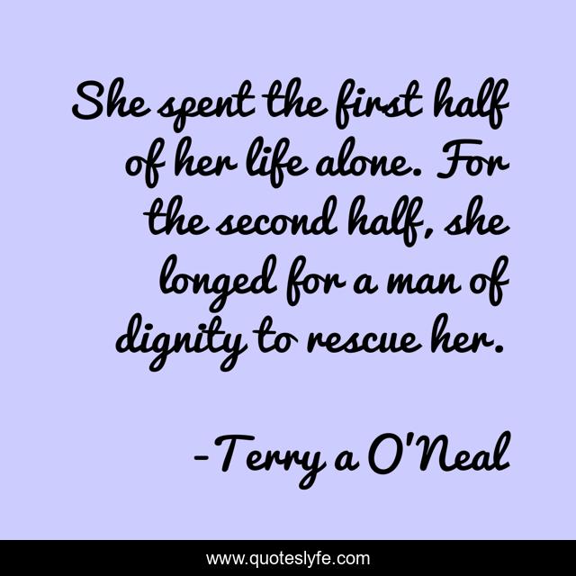 This page presents the quote "She spent the first half of her life alone. For the second half, she longed for a man of dignity to rescue her.". Author of this quote is Terry a O'Neal. This quote is about longing-for-love, loneliness, love, man-of-honor, affection,.