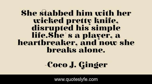 This page presents the quote "She stabbed him with her wicked pretty knife, disrupted his simple life.She's a player, a heartbreaker, and now she breaks alone.". Author of this quote is Coco J. Ginger. This quote is about cheating, love, cheating-lips, player, heartbreaker, jamie-weise, passion, friendship, affection,.