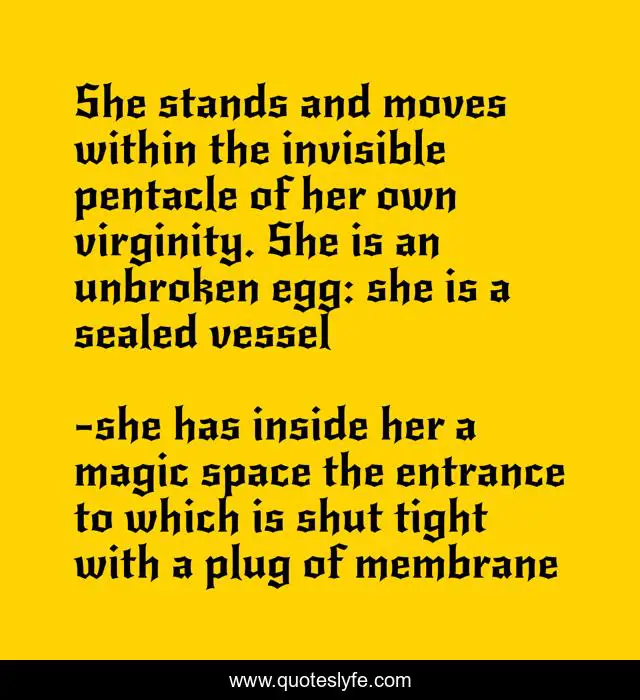 This page presents the quote "She stands and moves within the invisible pentacle of her own virginity. She is an unbroken egg: she is a sealed vessel". Author of this quote is she has inside her a magic space the entrance to which is shut tight with a plug of membrane. .
