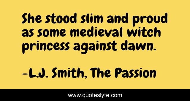 This page presents the quote "She stood slim and proud as some medieval witch princess against dawn.". Author of this quote is L.J. Smith, The Passion. This quote is about dark, gabriel, passions, visions,.