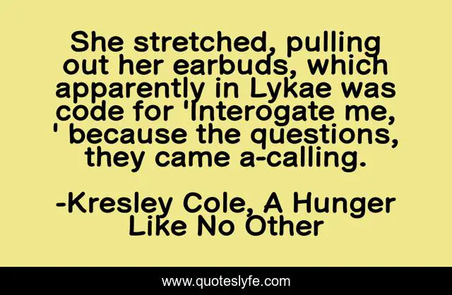 This page presents the quote "She stretched, pulling out her earbuds, which apparently in Lykae was code for 'Interogate me, ' because the questions, they came a-calling.". Author of this quote is Kresley Cole, A Hunger Like No Other. This quote is about funny, comedy, kresley-cole, lykae,.