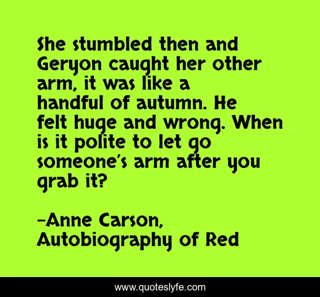 This page presents the quote "She stumbled then and Geryon caught her other arm, it was like a handful of autumn. He felt huge and wrong. When is it polite to let go someone’s arm after you grab it?". Author of this quote is Anne Carson, Autobiography of Red. .