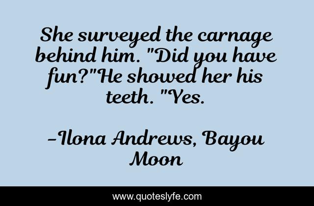 This page presents the quote "She surveyed the carnage behind him. "Did you have fun?"He showed her his teeth. "Yes.". Author of this quote is Ilona Andrews, Bayou Moon. This quote is about the-edge, death, ilona-andrews, william, bayou-moon, cerise,.