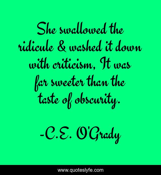 This page presents the quote "She swallowed the ridicule & washed it down with criticism, It was far sweeter than the taste of obscurity.". Author of this quote is C.E. O'Grady. This quote is about criticism, facing-critics, being-a-writer, obscurity, growing,.
