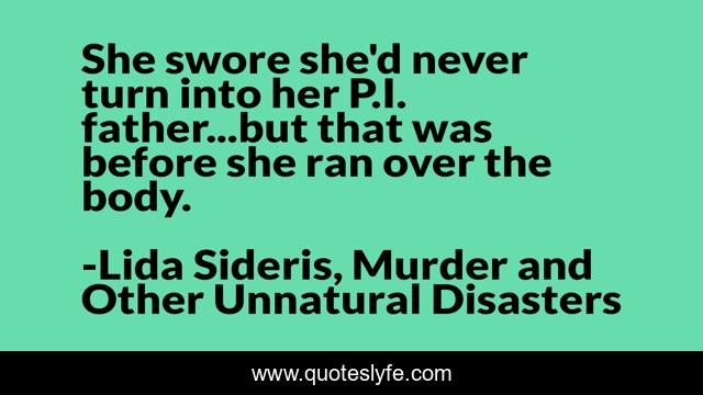 This page presents the quote "She swore she'd never turn into her P.I. father...but that was before she ran over the body.". Author of this quote is Lida Sideris, Murder and Other Unnatural Disasters. This quote is about mystery-novels, humor, romantic-suspense,.