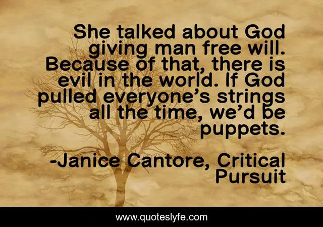This page presents the quote "She talked about God giving man free will. Because of that, there is evil in the world. If God pulled everyone’s strings all the time, we’d be puppets.". Author of this quote is Janice Cantore, Critical Pursuit. This quote is about god, free-will, evil, christianity,.