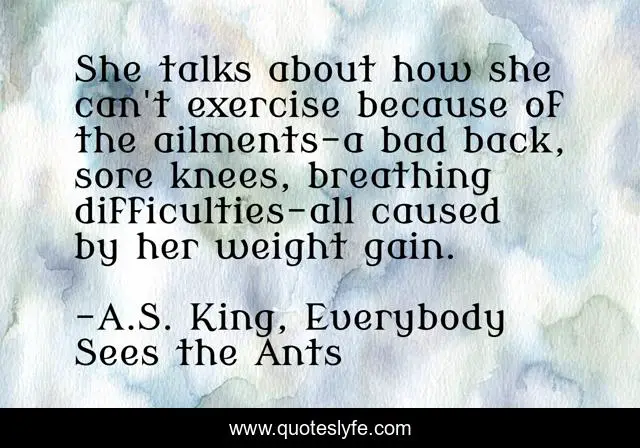 This page presents the quote "She talks about how she can't exercise because of the ailments-a bad back, sore knees, breathing difficulties-all caused by her weight gain.". Author of this quote is A.S. King, Everybody Sees the Ants. .