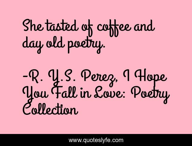 This page presents the quote "She tasted of coffee and day old poetry.". Author of this quote is R. Y.S. Perez, I Hope You Fall in Love: Poetry Collection. This quote is about coffee, love, girl, affection, poetry,.