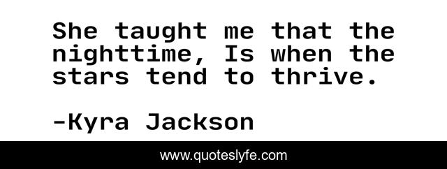 This page presents the quote "She taught me that the nighttime, Is when the stars tend to thrive.". Author of this quote is Kyra Jackson. This quote is about beautiful, nighttime, stars, thrive,.