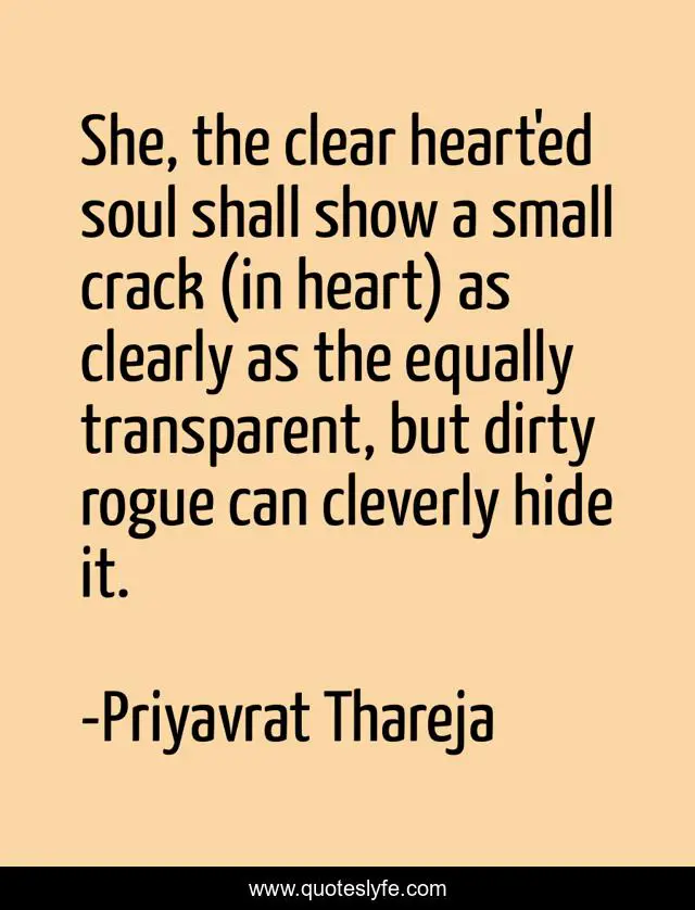 This page presents the quote "She, the clear heart'ed soul shall show a small crack (in heart) as clearly as the equally transparent, but dirty rogue can cleverly hide it.". Author of this quote is Priyavrat Thareja. This quote is about character, transparent,.