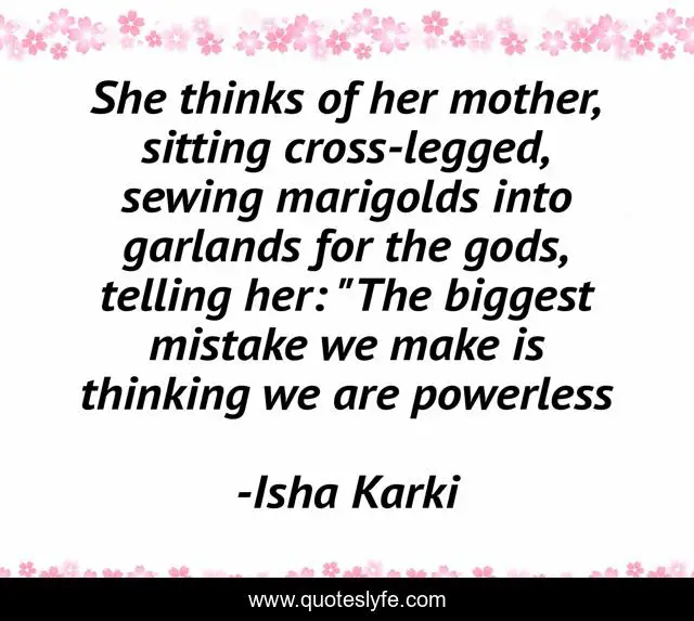 This page presents the quote "She thinks of her mother, sitting cross-legged, sewing marigolds into garlands for the gods, telling her: "The biggest mistake we make is thinking we are powerless". Author of this quote is Isha Karki. This quote is about power, firebird, science-fiction,.