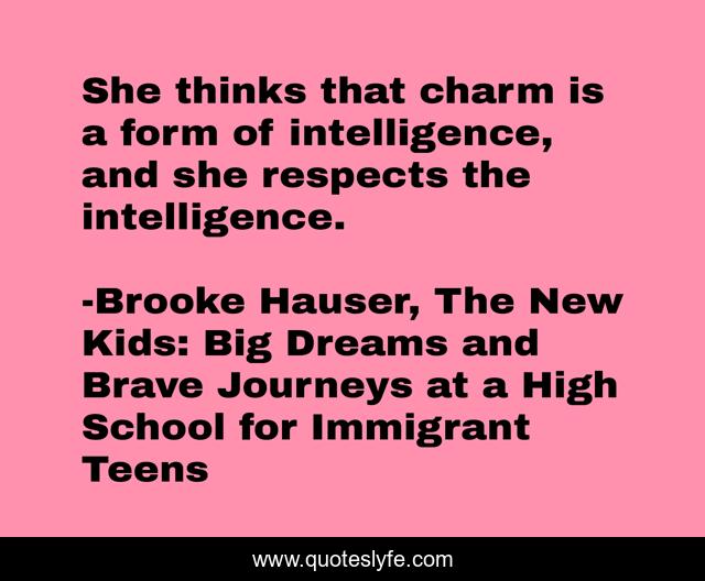 This page presents the quote "She thinks that charm is a form of intelligence, and she respects the intelligence.". Author of this quote is Brooke Hauser, The New Kids: Big Dreams and Brave Journeys at a High School for Immigrant Teens. This quote is about influence, interpersonal-intelligence, salesmanship,.
