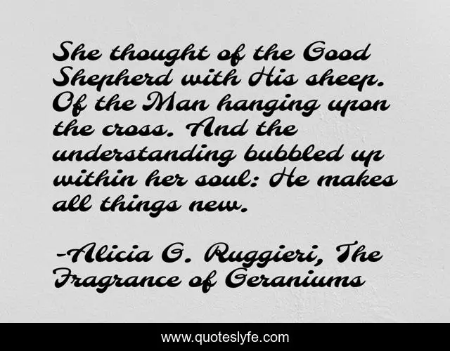 This page presents the quote "She thought of the Good Shepherd with His sheep. Of the Man hanging upon the cross. And the understanding bubbled up within her soul: He makes all things new.". Author of this quote is Alicia G. Ruggieri, The Fragrance of Geraniums. This quote is about abuse-survivors, first-love, christian-fiction, 1930s, historical-fiction, inspirational, enthusiasm, women-s-fiction, abundant-life,.