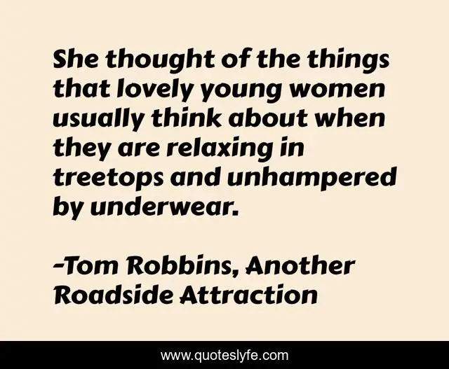 This page presents the quote "She thought of the things that lovely young women usually think about when they are relaxing in treetops and unhampered by underwear.". Author of this quote is Tom Robbins, Another Roadside Attraction. This quote is about another-roadside-attraction, amanda, underwear, trees, tom-robbins,.