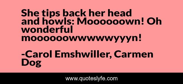 This page presents the quote "She tips back her head and howls: Moooooown! Oh wonderful moooooowwwwwyyyn!". Author of this quote is Carol Emshwiller, Carmen Dog. This quote is about joy, humor, moon,.
