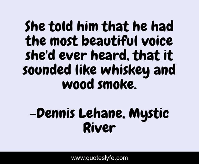 This page presents the quote "She told him that he had the most beautiful voice she'd ever heard, that it sounded like whiskey and wood smoke.". Author of this quote is Dennis Lehane, Mystic River. This quote is about beautiful, description, mystic-river, smoke, voice, man,.
