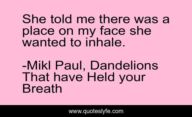 This page presents the quote "She told me there was a place on my face she wanted to inhale.". Author of this quote is Mikl Paul, Dandelions That have Held your Breath. This quote is about prose, prose-poetry, love, love-story, affection,.