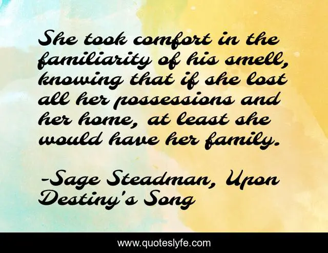 This page presents the quote "She took comfort in the familiarity of his smell, knowing that if she lost all her possessions and her home, at least she would have her family.". Author of this quote is Sage Steadman, Upon Destiny's Song. This quote is about family-relationships, marriage,.